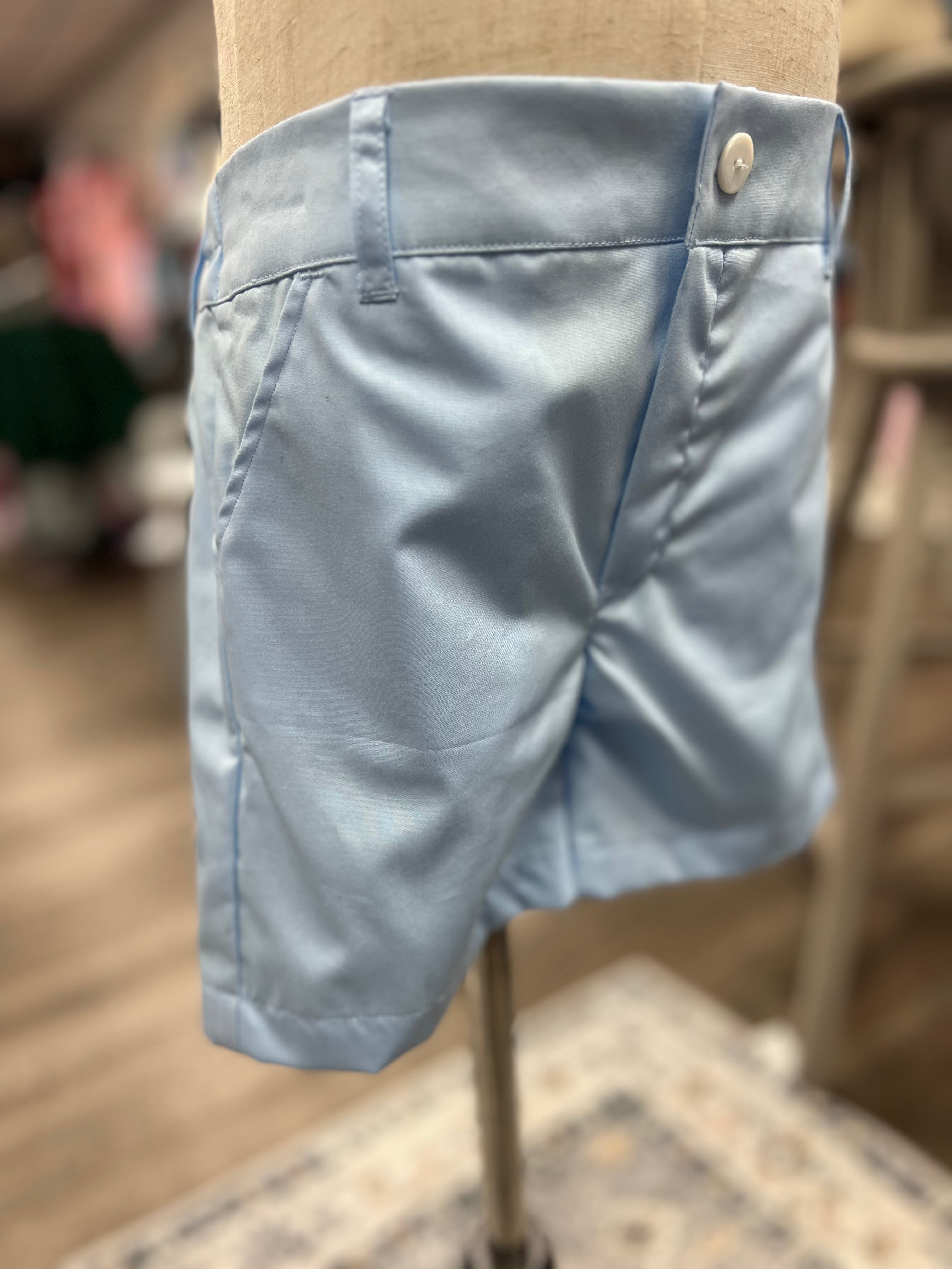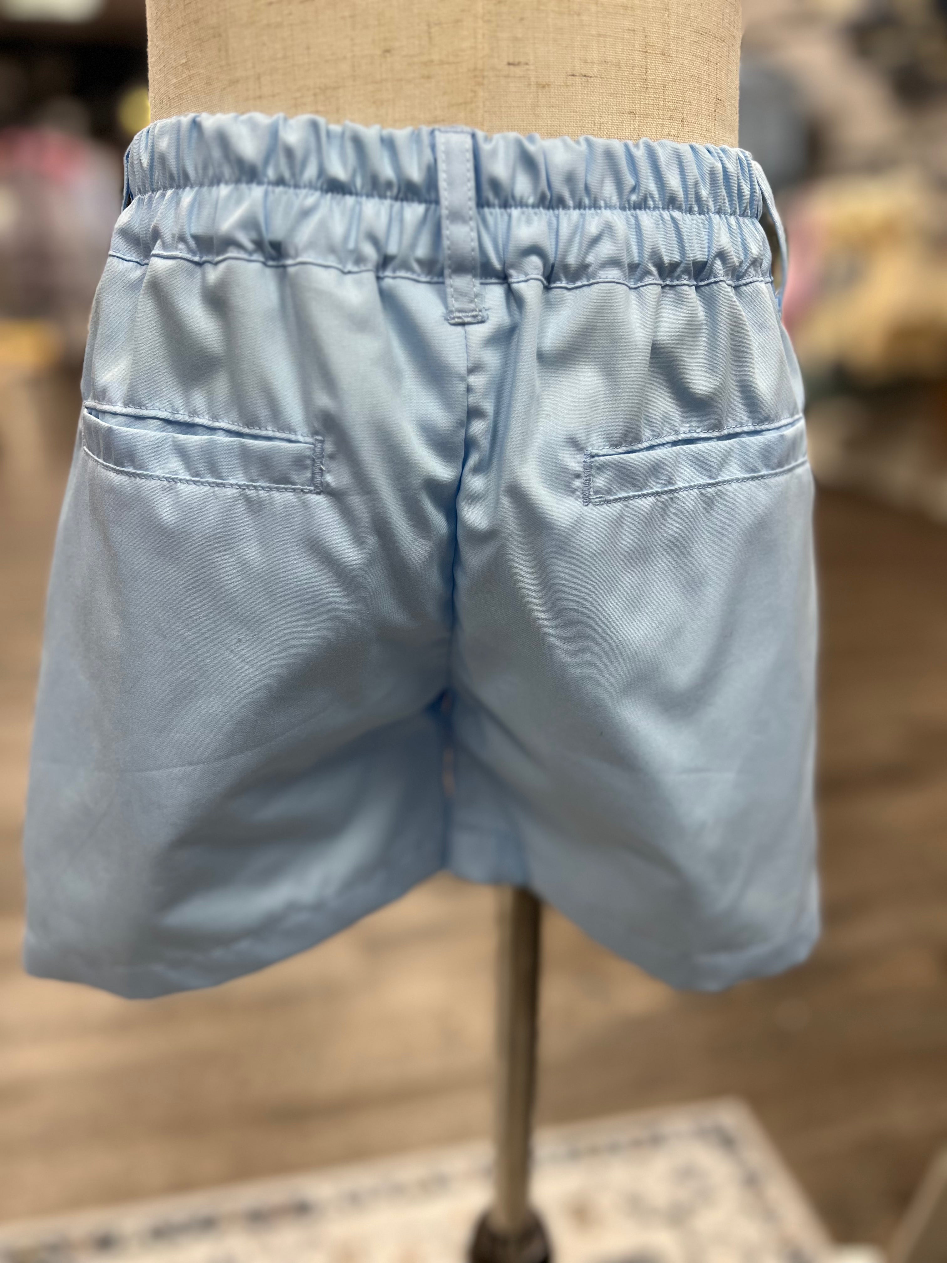 • Pastel blue tailored shorts with an elastic-back waist for comfort