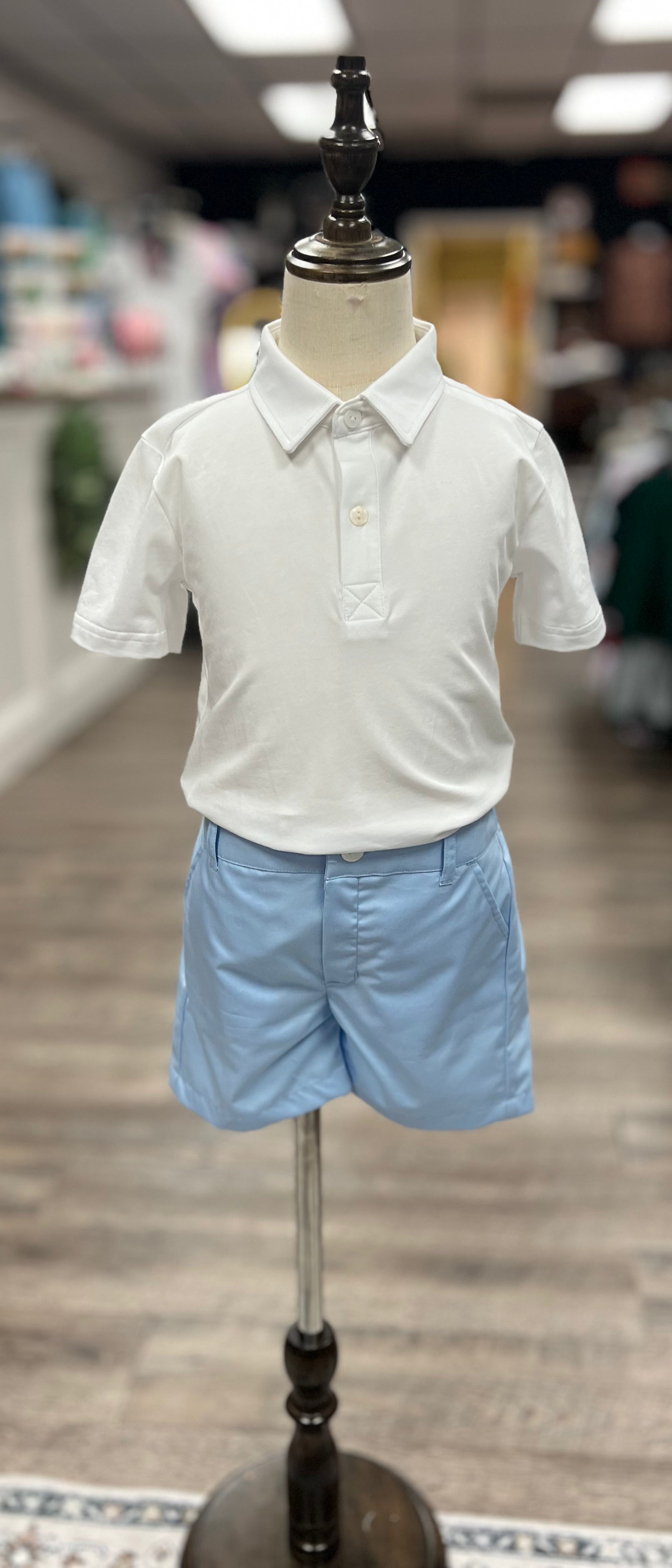 This classic heirloom polo set offers a polished look for your little gentleman. Featuring a crisp white polo with an optional hand-stitched monogram, this set pairs effortlessly with pastel blue tailored shorts, making it perfect for Easter, church, and family portraits.