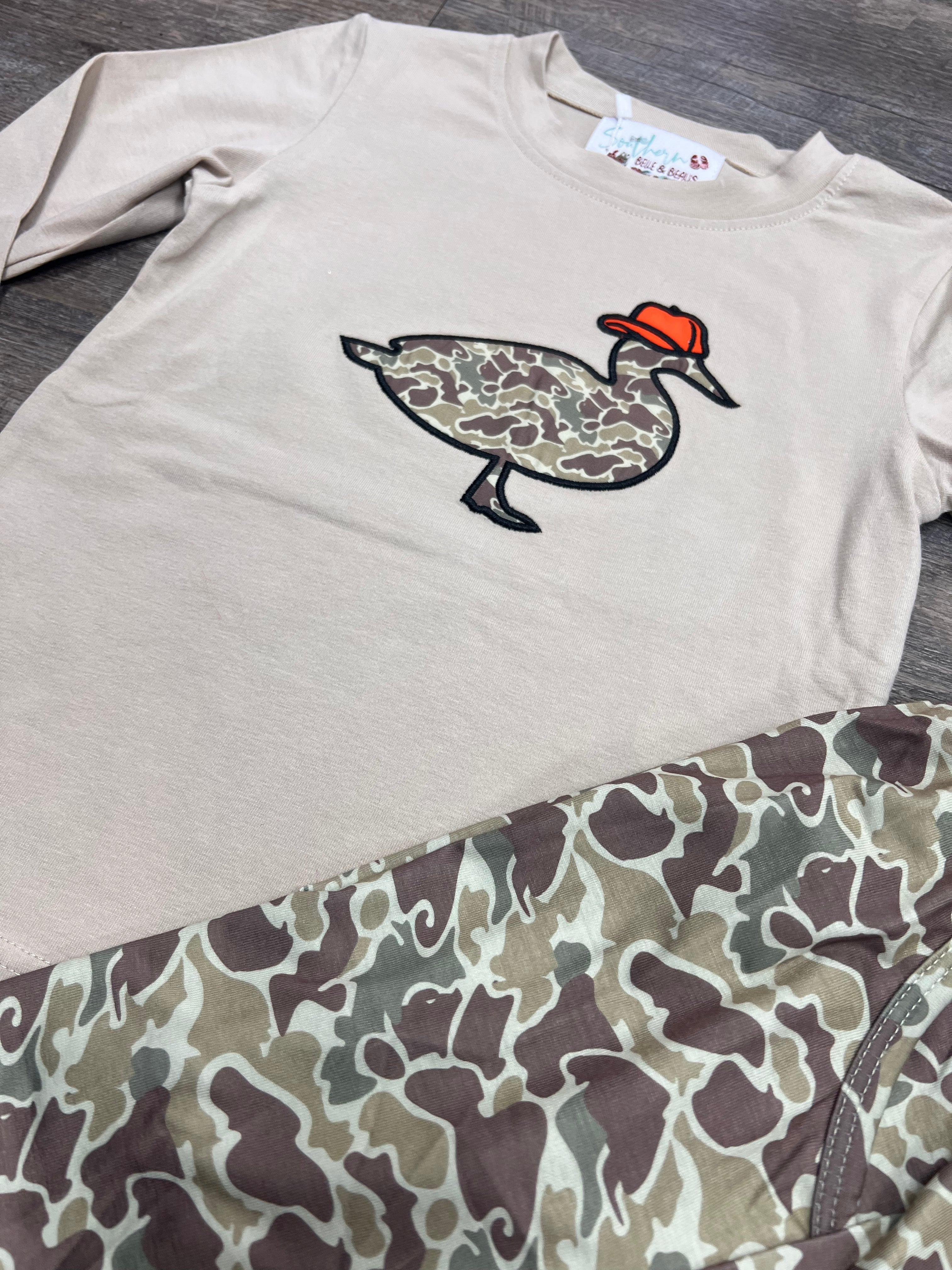 Hunt in style with Liam's Duck Camp joggers and shirt! These comfortable knit camo joggers are perfect for everyday wear and feature a tan long sleeve round neck shirt with a cute duck applique wearing a hat. Perfect for boys who love hunting (and ducks)!