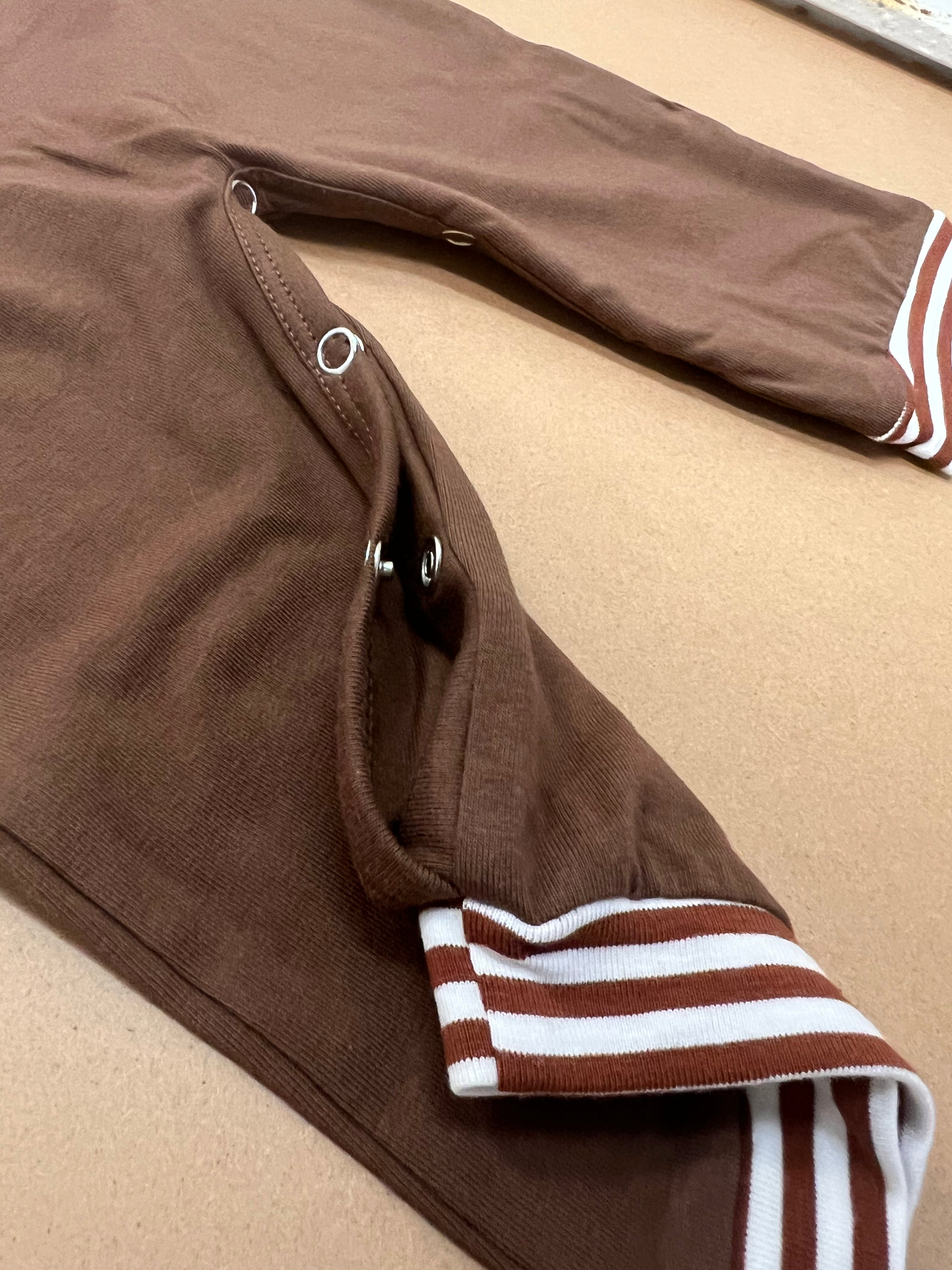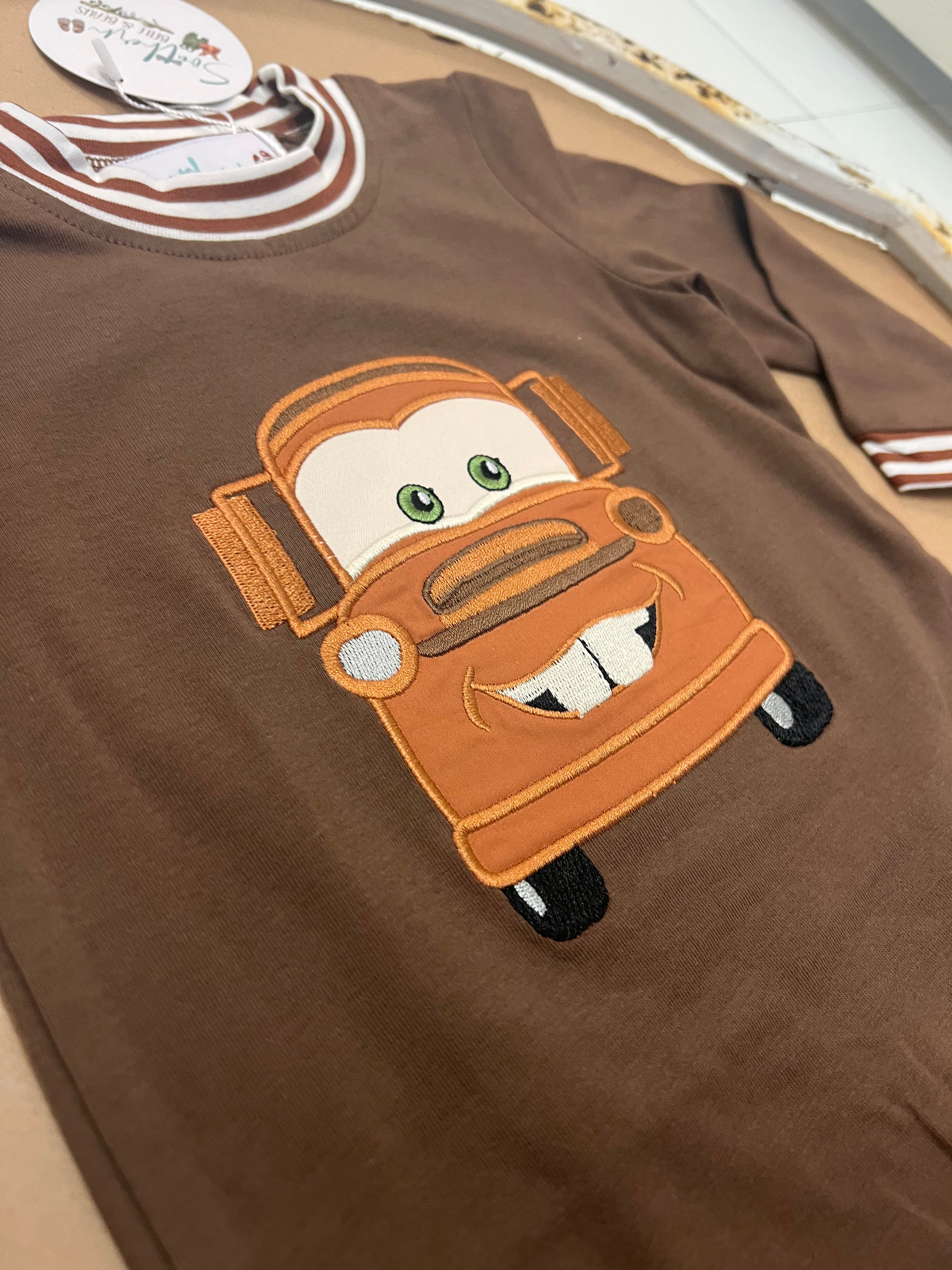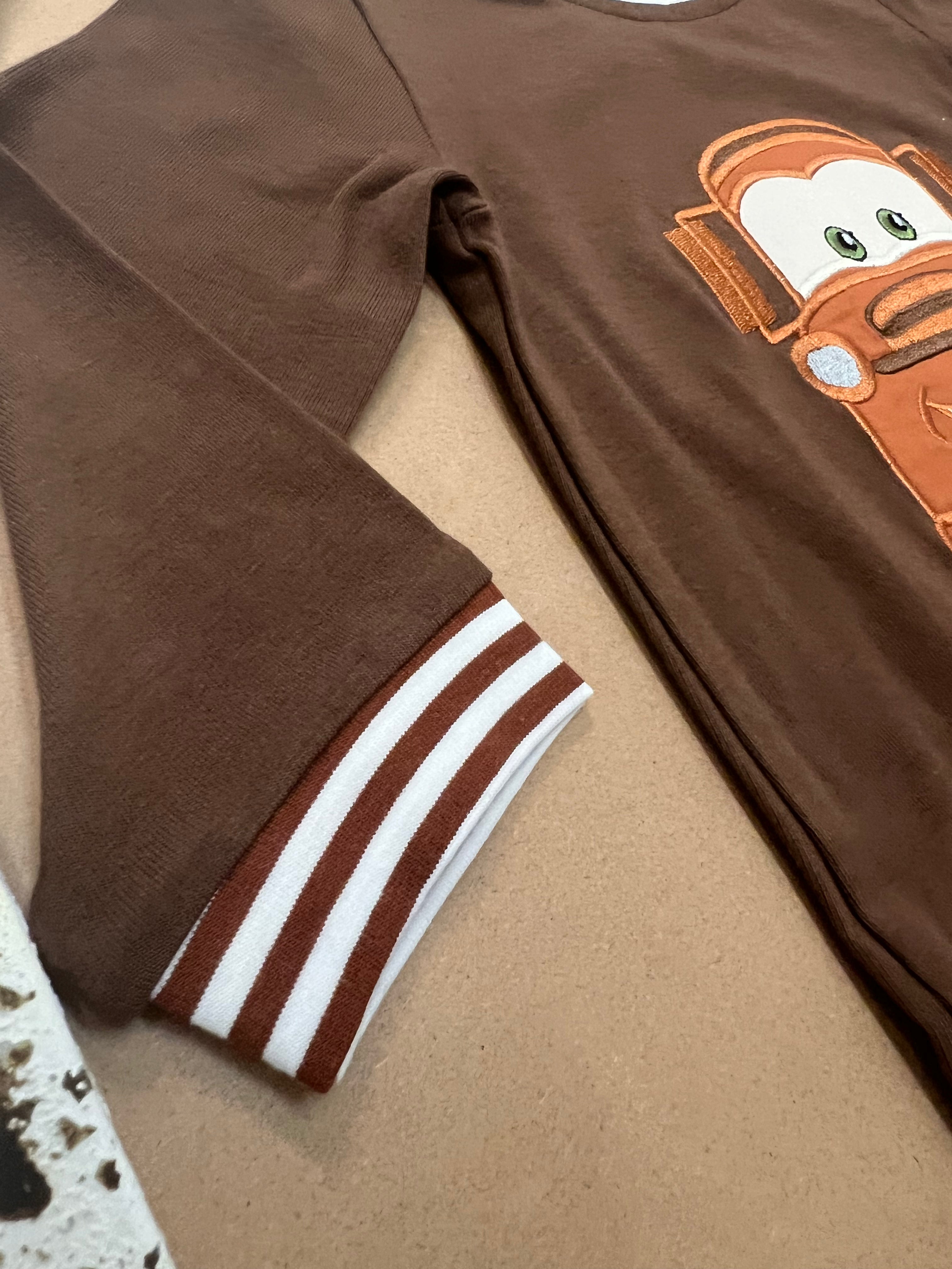 Your little guy will be cute and tow-tally on the go in our Mater on the Move Romper! Inspired by everyone’s favorite rusty tow truck, this brown knit bubble features an adorable applique truck on the front, striped trim at the collar and cuffs, and snaps along the legs for easy diaper changes.