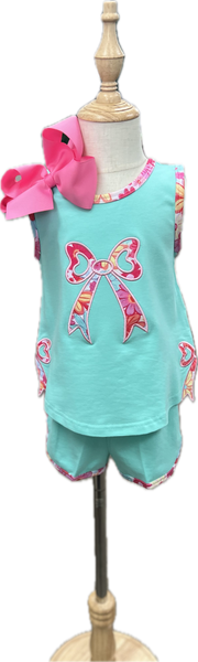 Sweet meets sporty in this comfy pink short set with the cutest bow details! Featuring contrast trim and a large bow appliqué in pink paisley tones, this set is perfect for playdays and picture days alike.