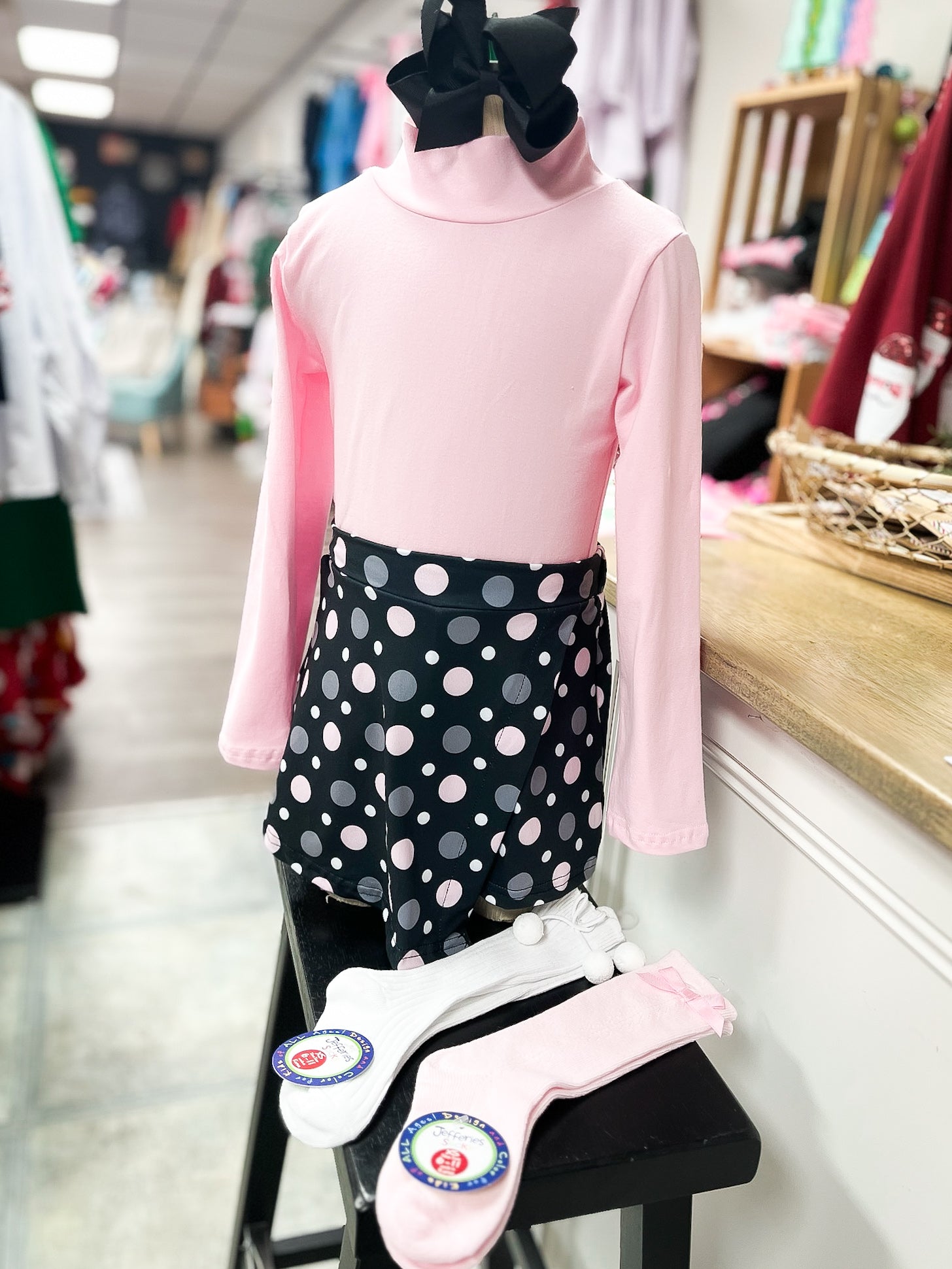 Get playful with Pipers Polk-a-dot Skort Set! This girl's outfit features a pink knit turtleneck top and a sassy black skort adorned with pink and grey polka dots. Complete the look with knee high socks or tights for added flair.