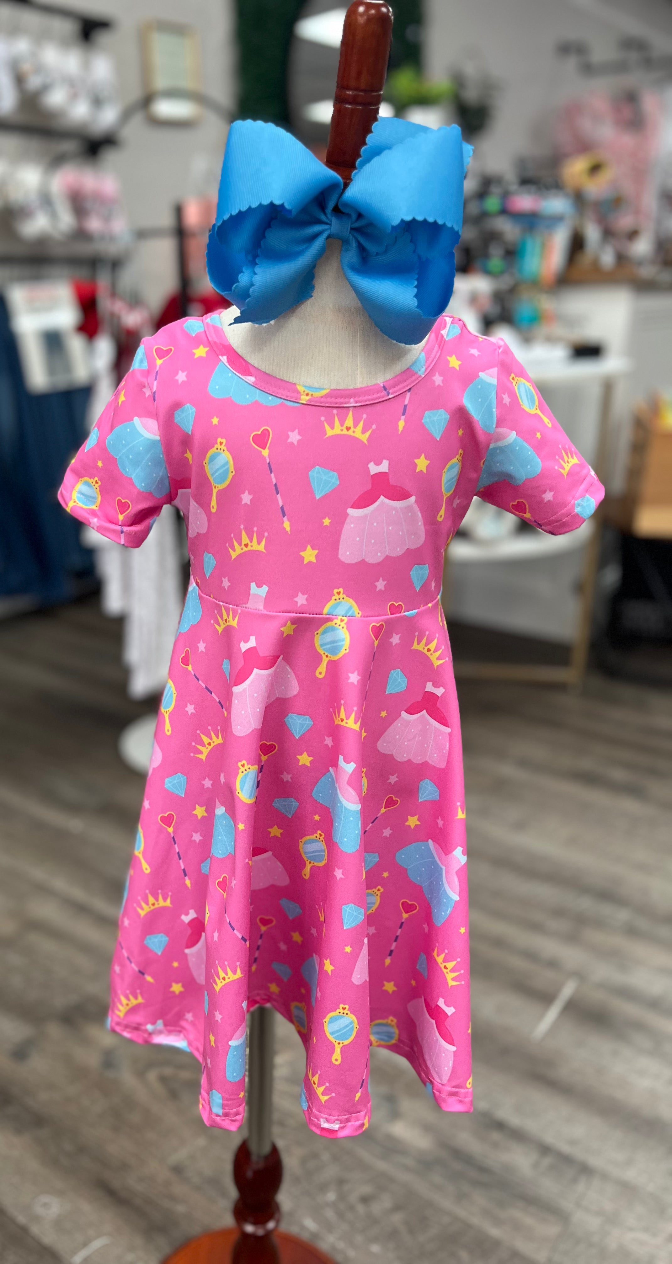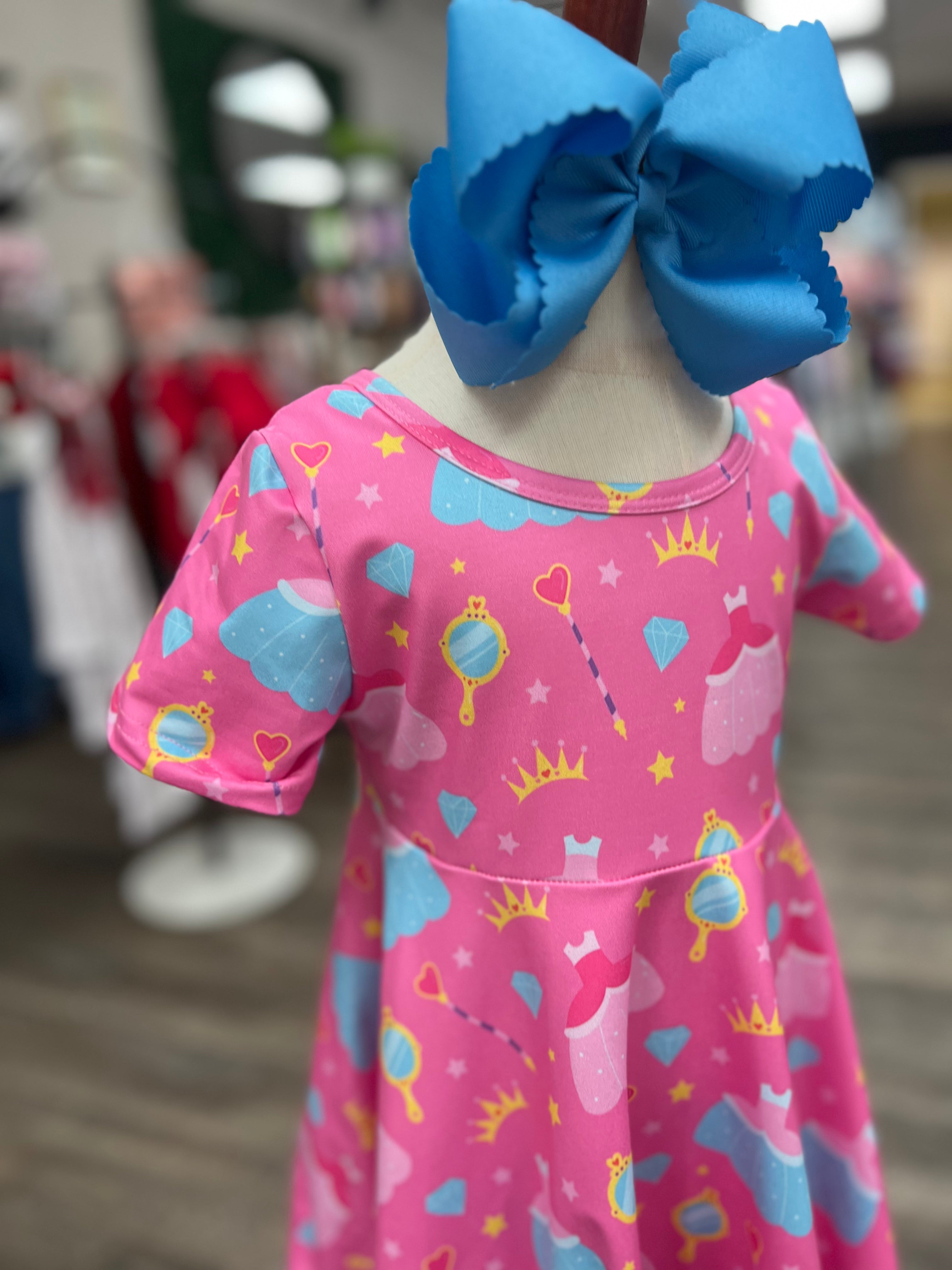 Pretty in Pink Princess Twirl Dress Let the royal adventures begin! This darling dress is made for twirling through fairy tales, tea parties, and magical make-believe. Details: Soft, lightweight knit with extra twirl power Allover princess print featuring crowns, gowns, mirrors & more Scoop neckline with a comfy stretch fit Short sleeves for year-round wear True to size and super soft for all-day play Available in sizes: 2T – 6/7 Perfect for birthdays, dress-up days, or any little girl who rules her world in style!