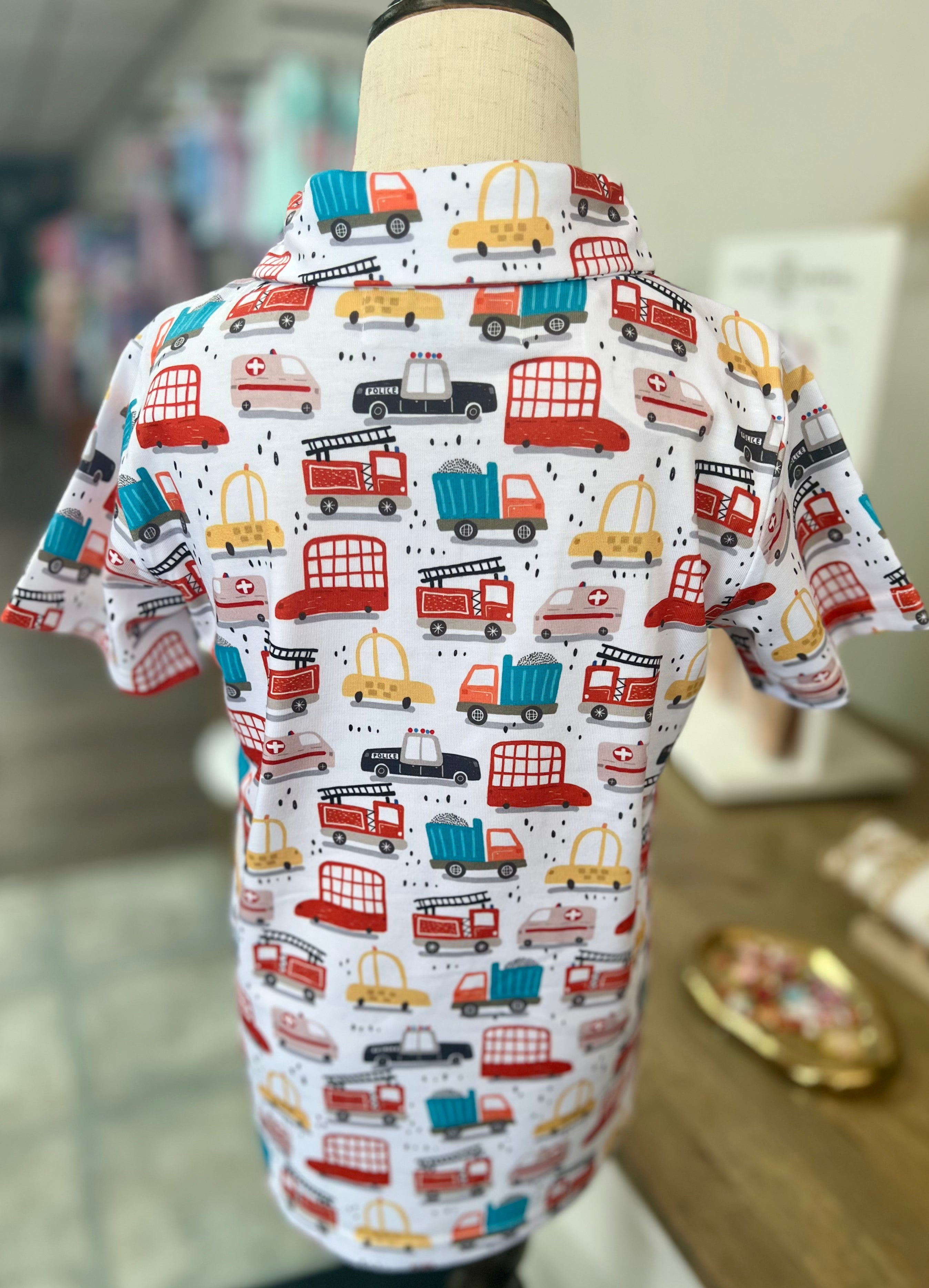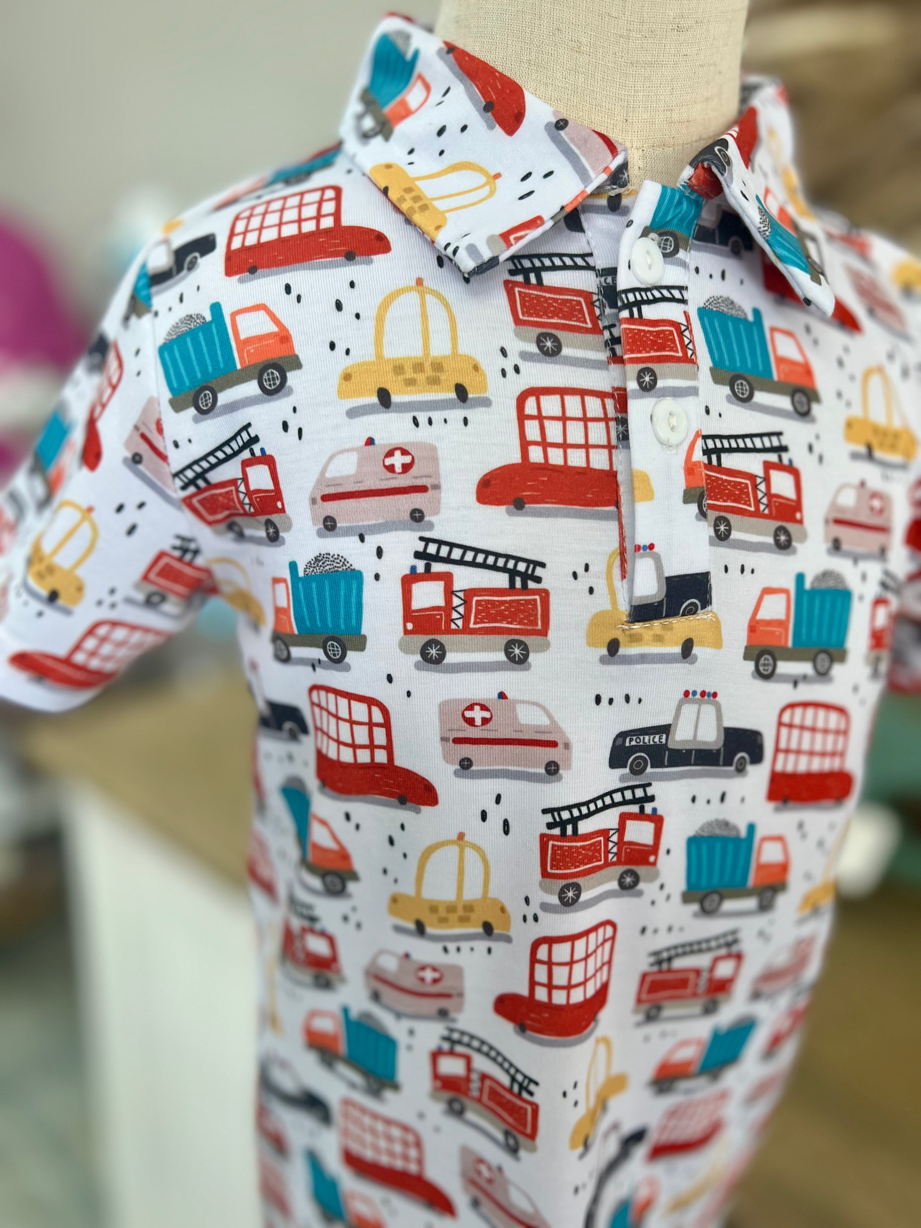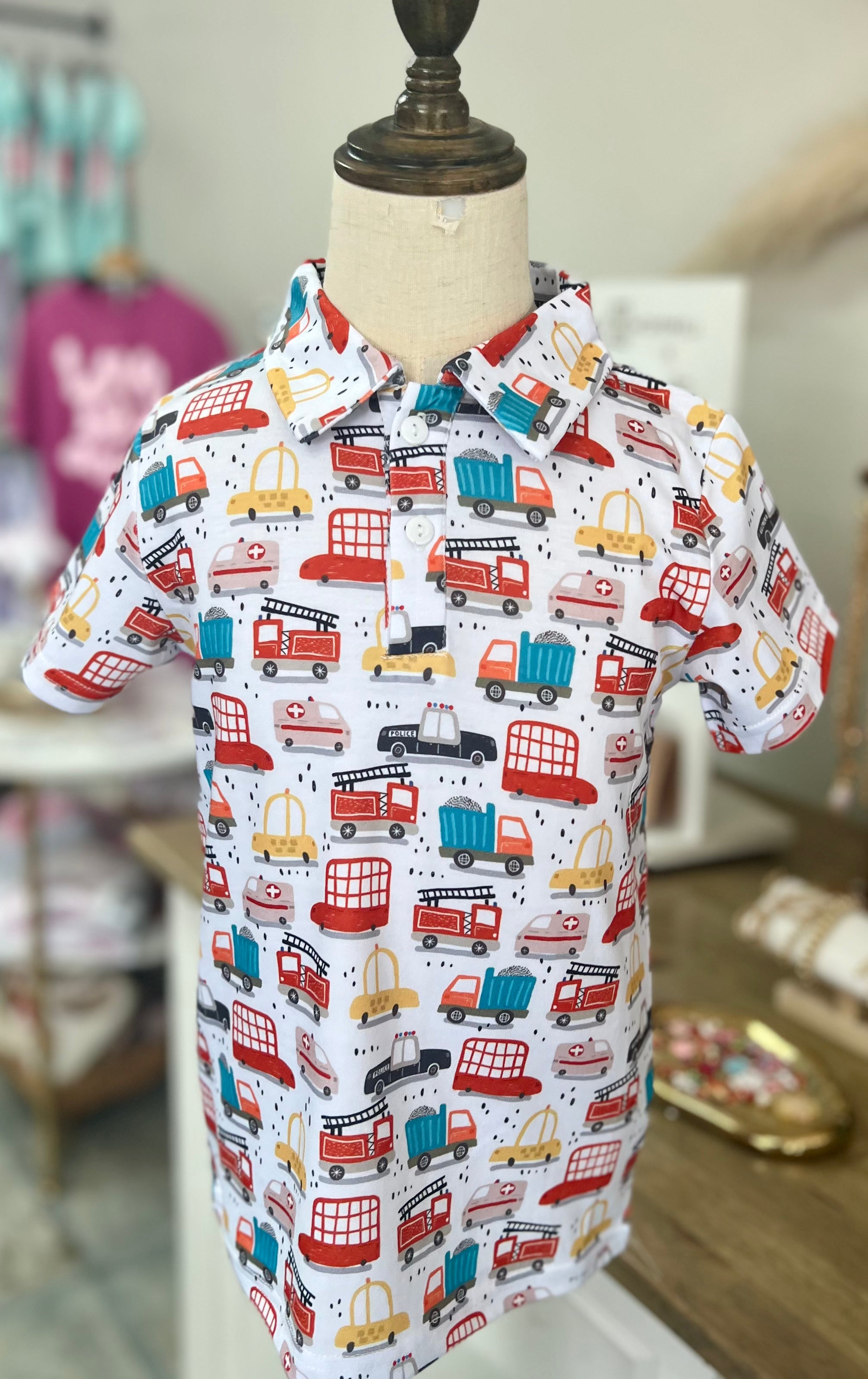 Stay cool and stylish on all your adventures with our Rescue Ranger Polo! Made from super soft fabric, this polo features a playful rescue vehicle print. Perfect for any little boy, this short sleeve polo will be a hit.