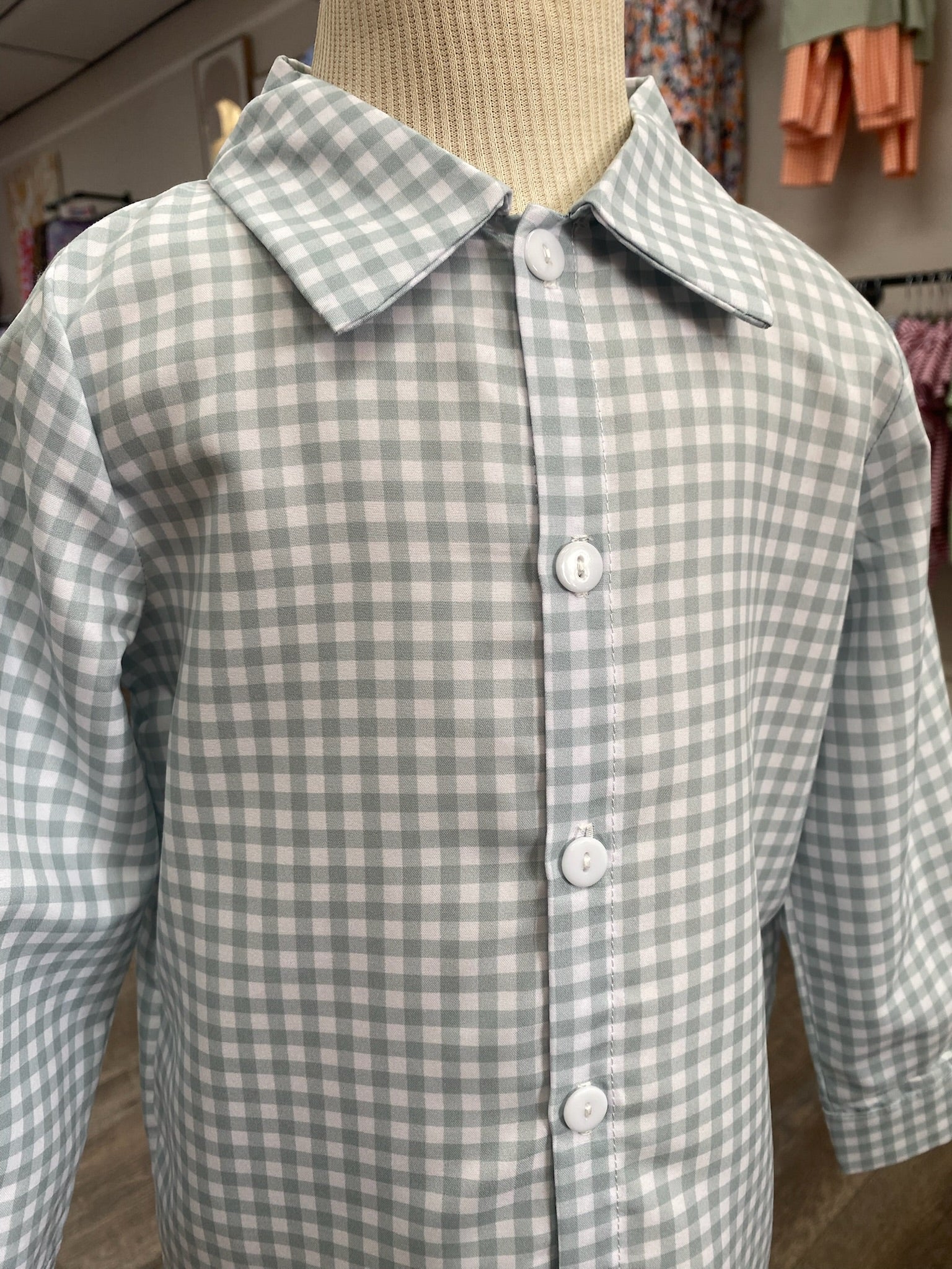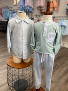 This isn’t just any button down — it’s crafted from the softest, smoothest fabric that feels like a gentle hug against the skin. Designed in a muted sage gingham, it’s breathable, lightweight, and perfect for layering under sweaters or wearing on its own. The classic collar and crisp white buttons give it a polished look, while the buttery-soft texture keeps him comfortable from playground to family photos.