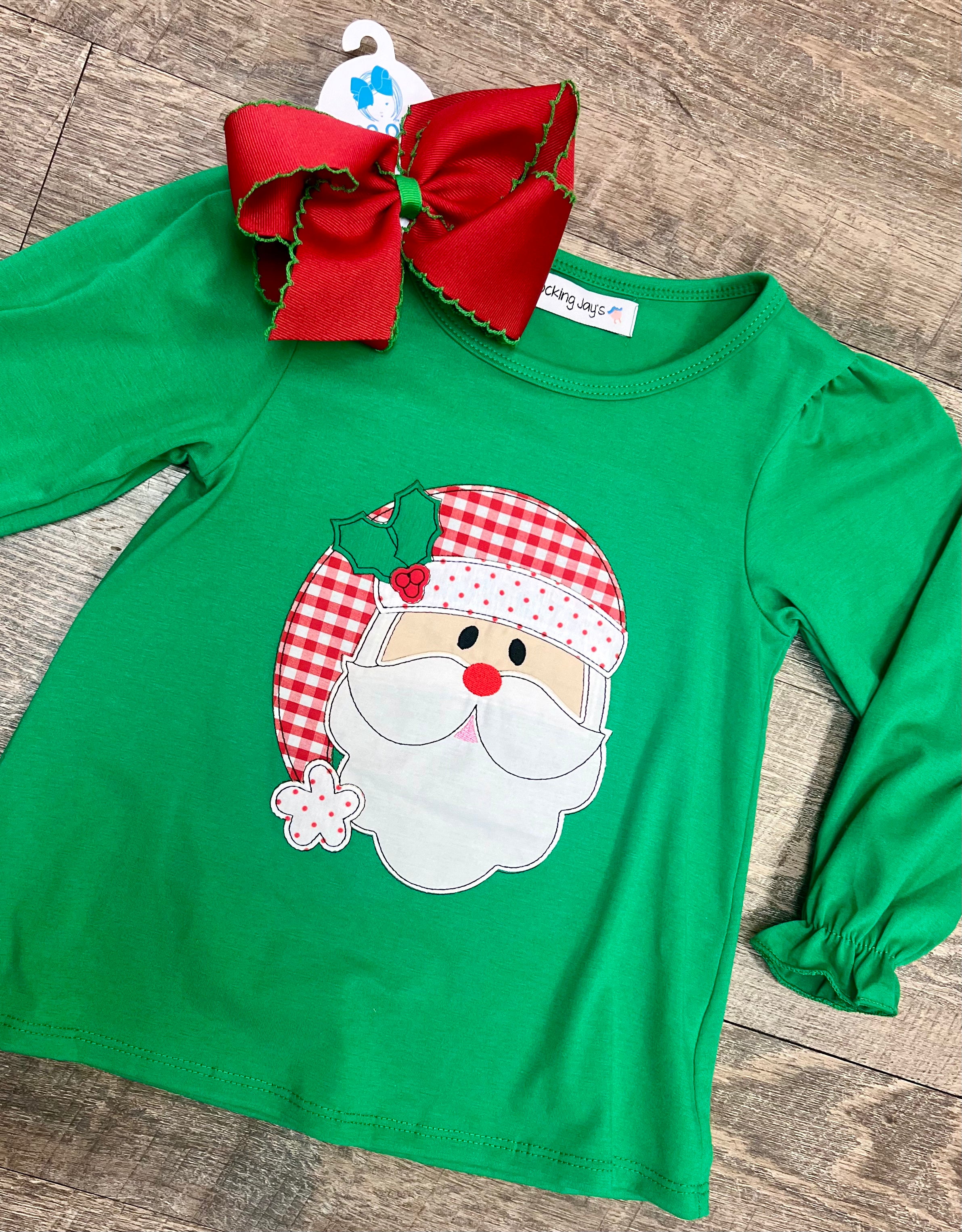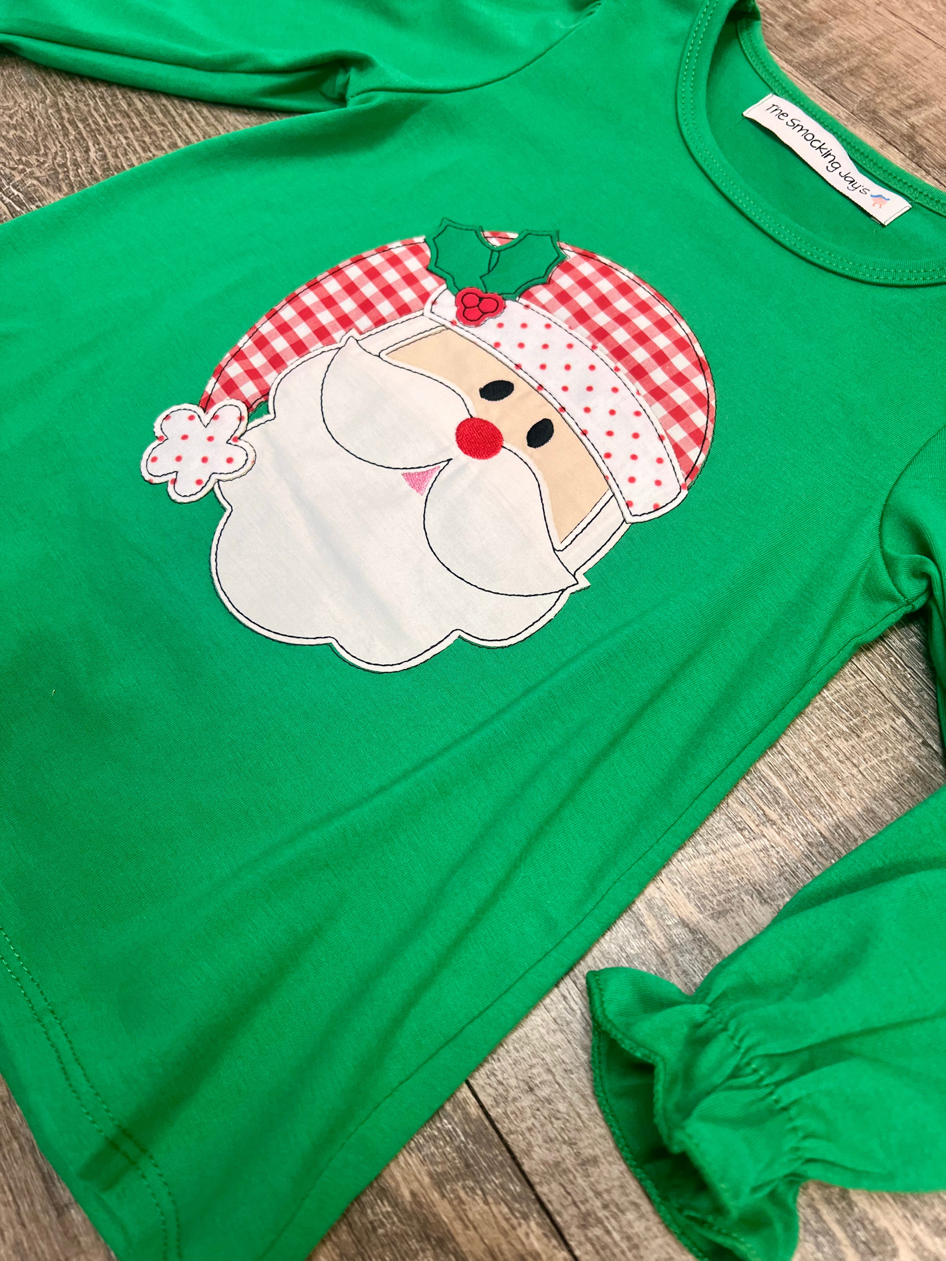 This long sleeve green knit top is perfect for the holiday season! With ruffled sleeves and a festive Santa applique, your little girl will feel like a jolly elf. Stay cozy and stylish with this Saint Nick Girl Tee.
