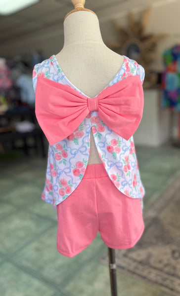 This sleeveless swing top features an all-over rose + bow print, finished with a darling peek-a-boo back and oversized coral bow that steals the show. The matching shorts/diaper bottom are soft, giving her room to twirl, play, and stay comfy all day.