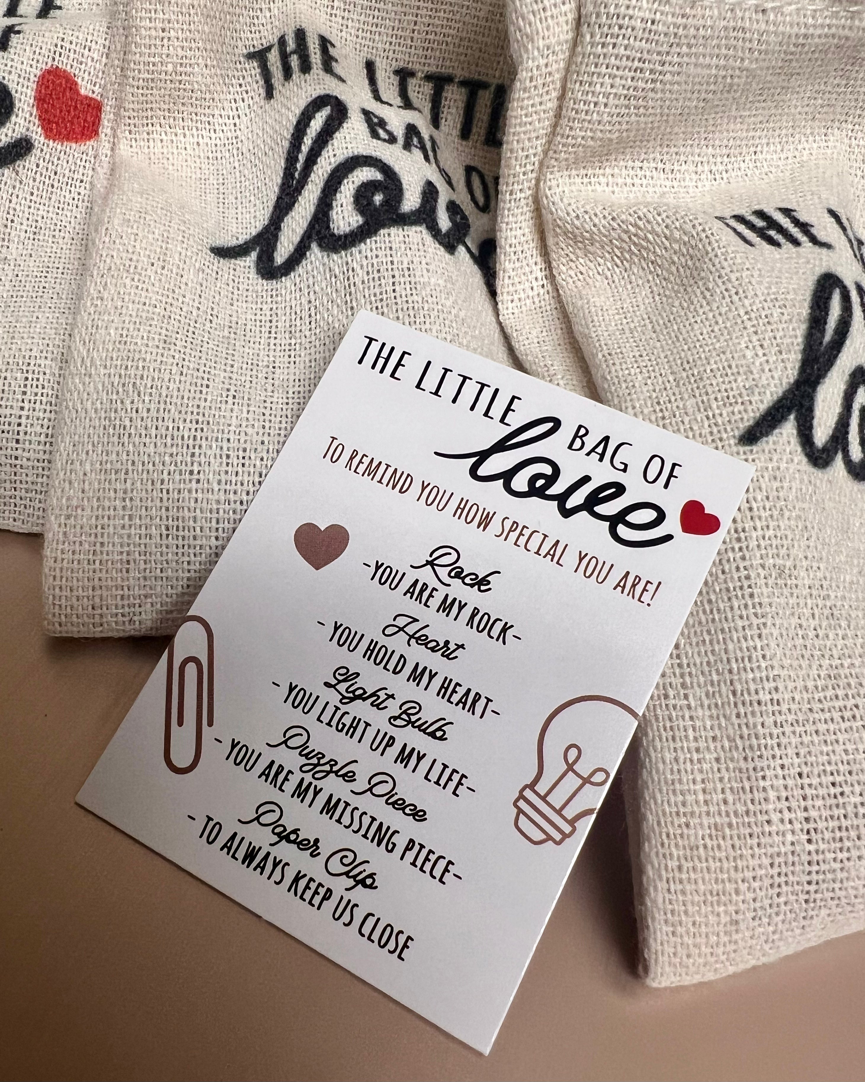 Remind someone of their worth with The Little Bag of Love. This quirky bag includes a rock (you're my rock), a heart (you hold my heart), a light bulb (you light up my life), a puzzle piece (you're my missing piece), and a paper clip (always keep us close).