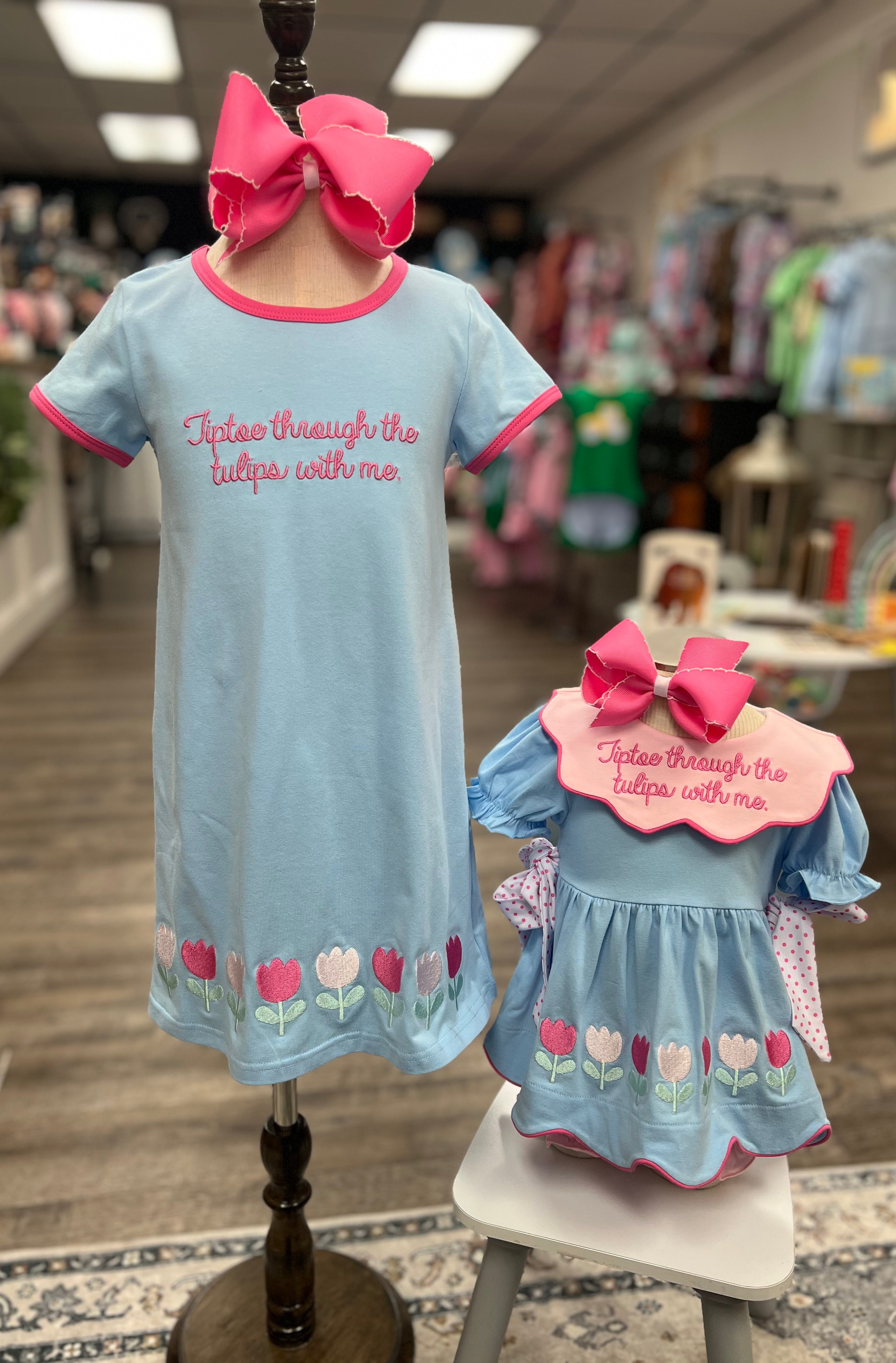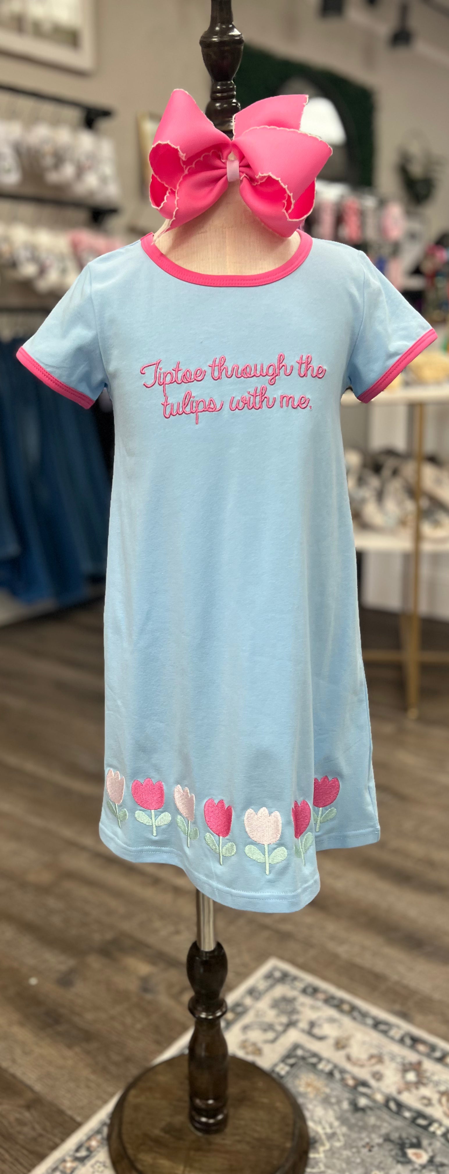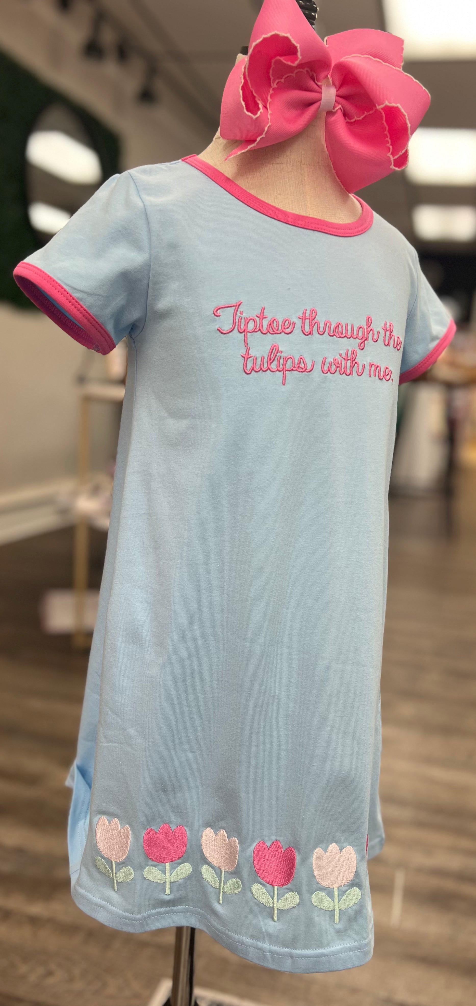 Soft as a prayer and sweet as spring, this precious knit dress is full of joy and gentle faith. Designed to match the Tiptoe By Faith Diaper Set, this dress features the same embroidered message, "Tiptoe through the tulips with me"-in cheerful pink thread across the chest. A row of embroidered tulips lines the hem like a blooming garden, perfect for twirling through Sunday mornings or sunny spring days.